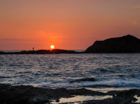 해가 지는 순간, 분홍빛 구름과 느리게 흐르는 파도가 하루의 끝을 부드럽게 감싼다. 바위 위에 남은 빛은 사라지기 전까지..