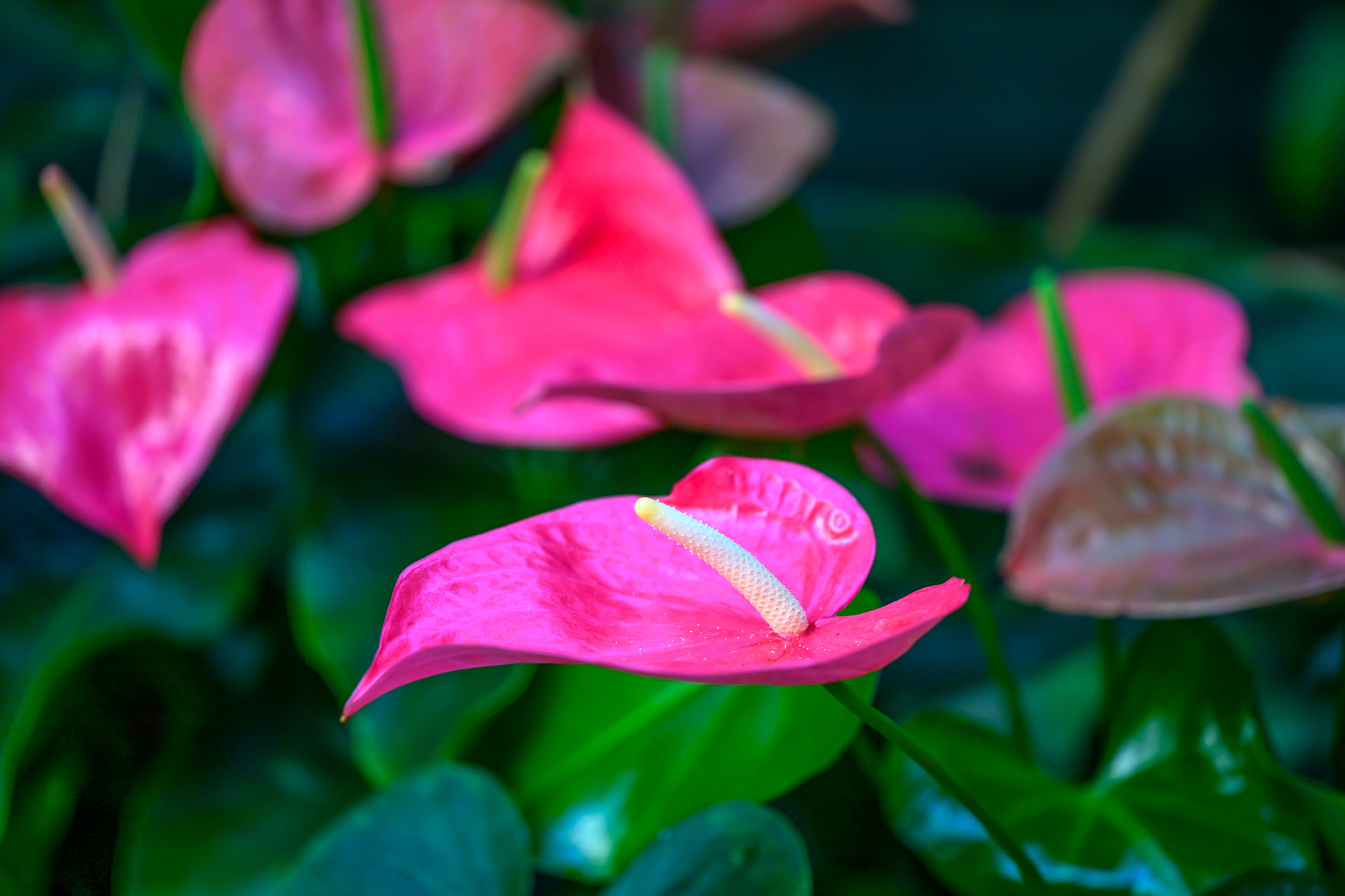 • 색상과 질감: 사진 속 안스리움은 아주 선명한 분홍빛(Pink)을 띠고 있으며, 불염포 표면의 매끄럽고 광택이 나는 질감이 잘 포착되었습니다.