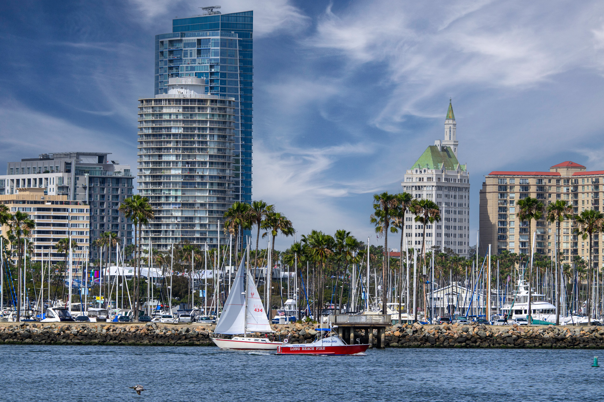 롱비치 시를 배경으로 돛단배와 소방소 배가 수로를 지납니다.