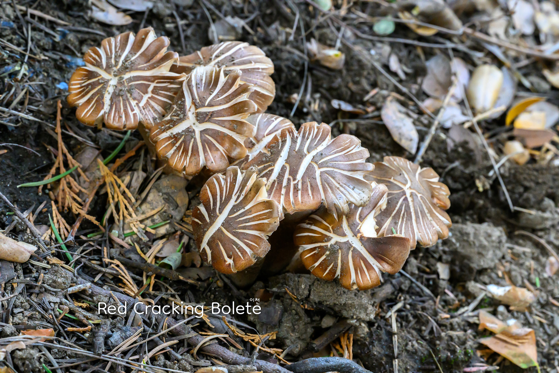 갈색 갓이 마르며 갈라지고, 그 틈 사이로 밝은 기저층이 드러나는 독특한 무늬를 지닌 그물버섯류.
