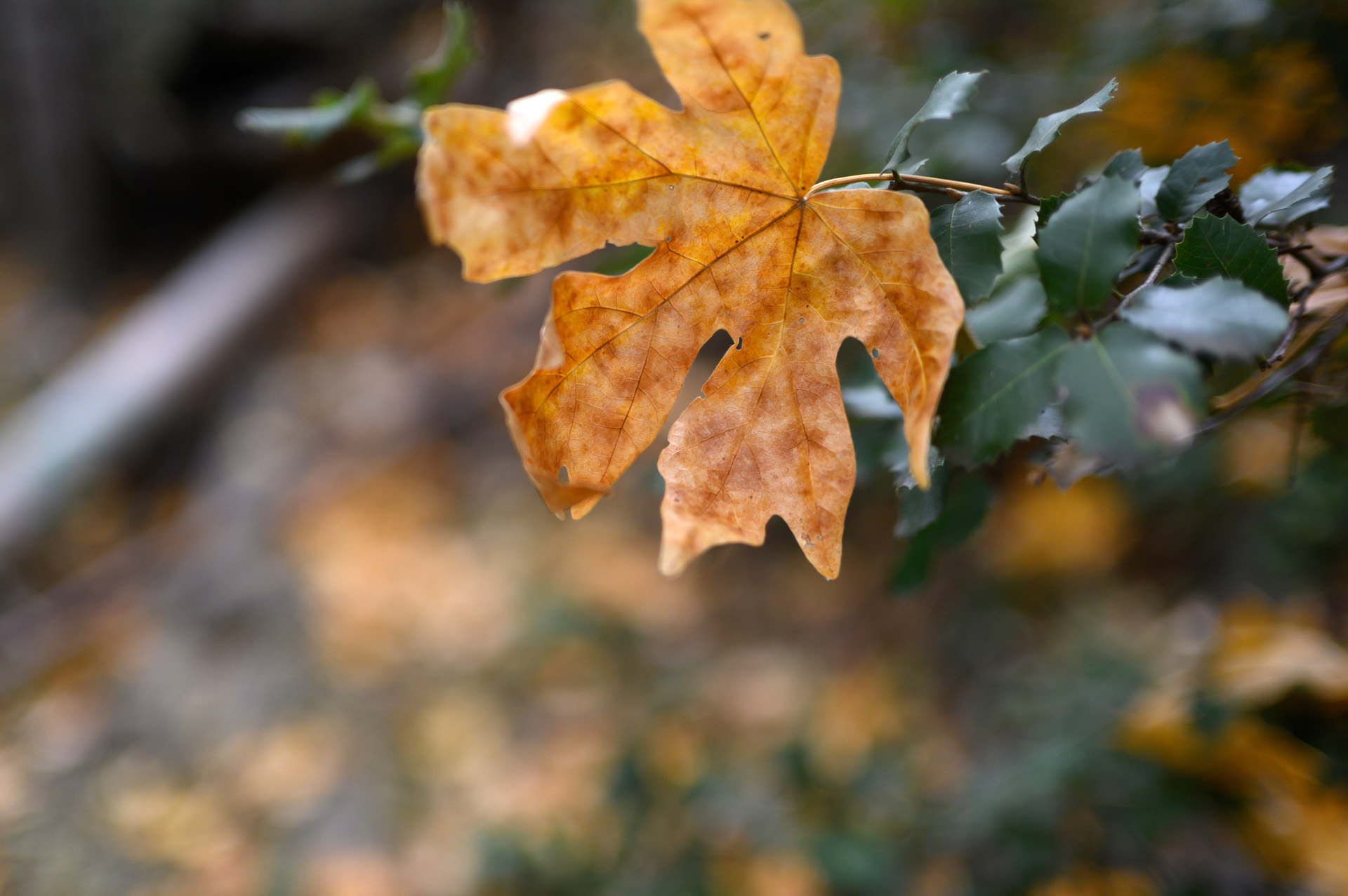 가을빛을 머금은 잎 하나가 아직 가지를 떠나지 못한 채 머물러 있다.